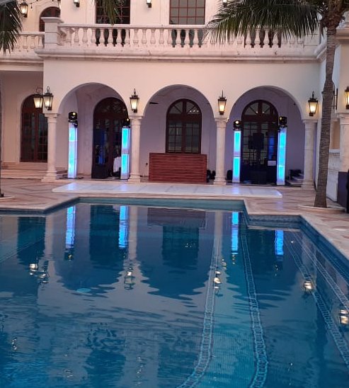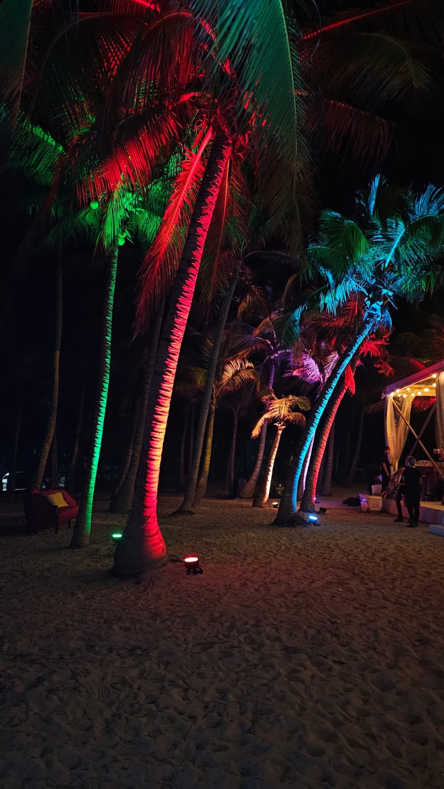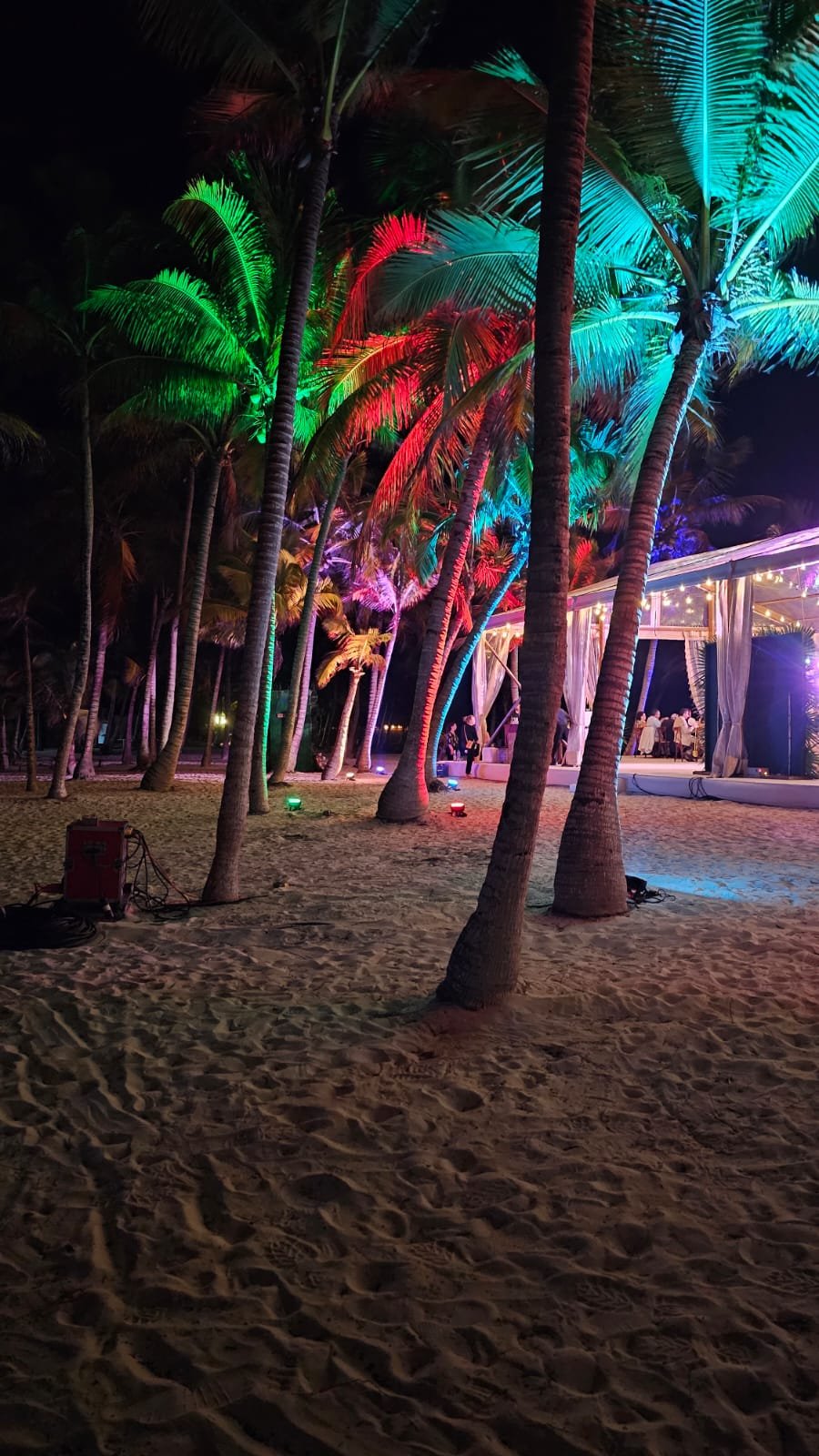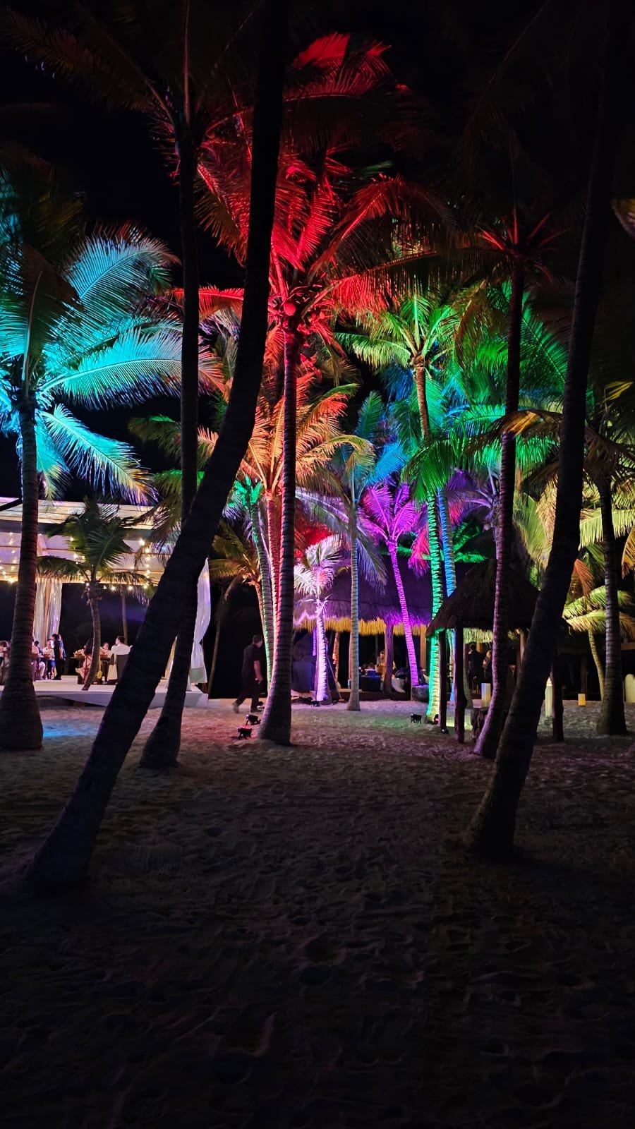 Uplight LED lights, also known as atmosphere lights, are located on the floor and can illuminate columns, palm trees, and patios. They are used on a fixed color of your choice (or combination of different colors) and help to create a nice visual setting at the Venue.