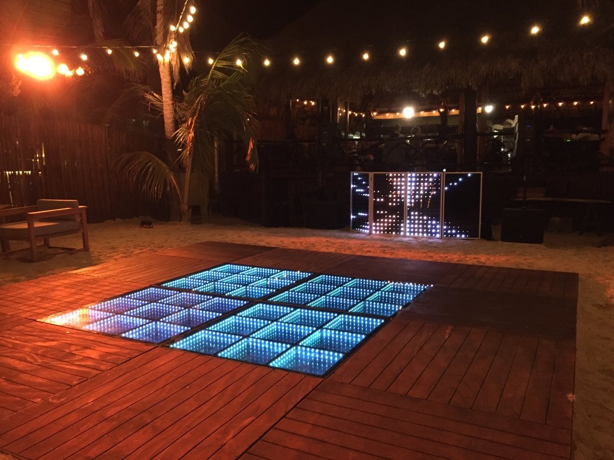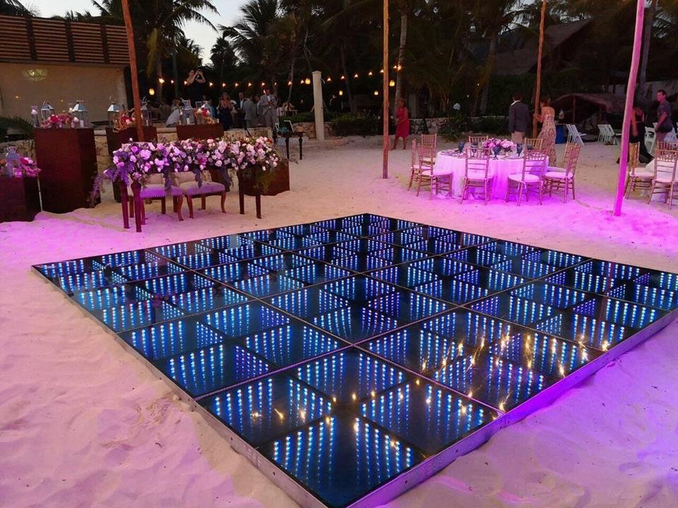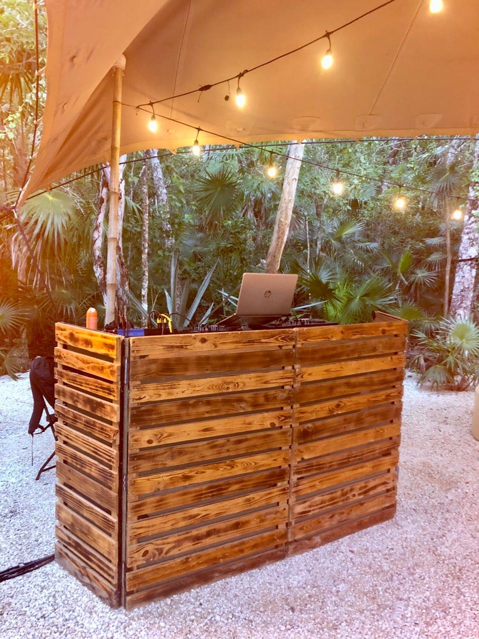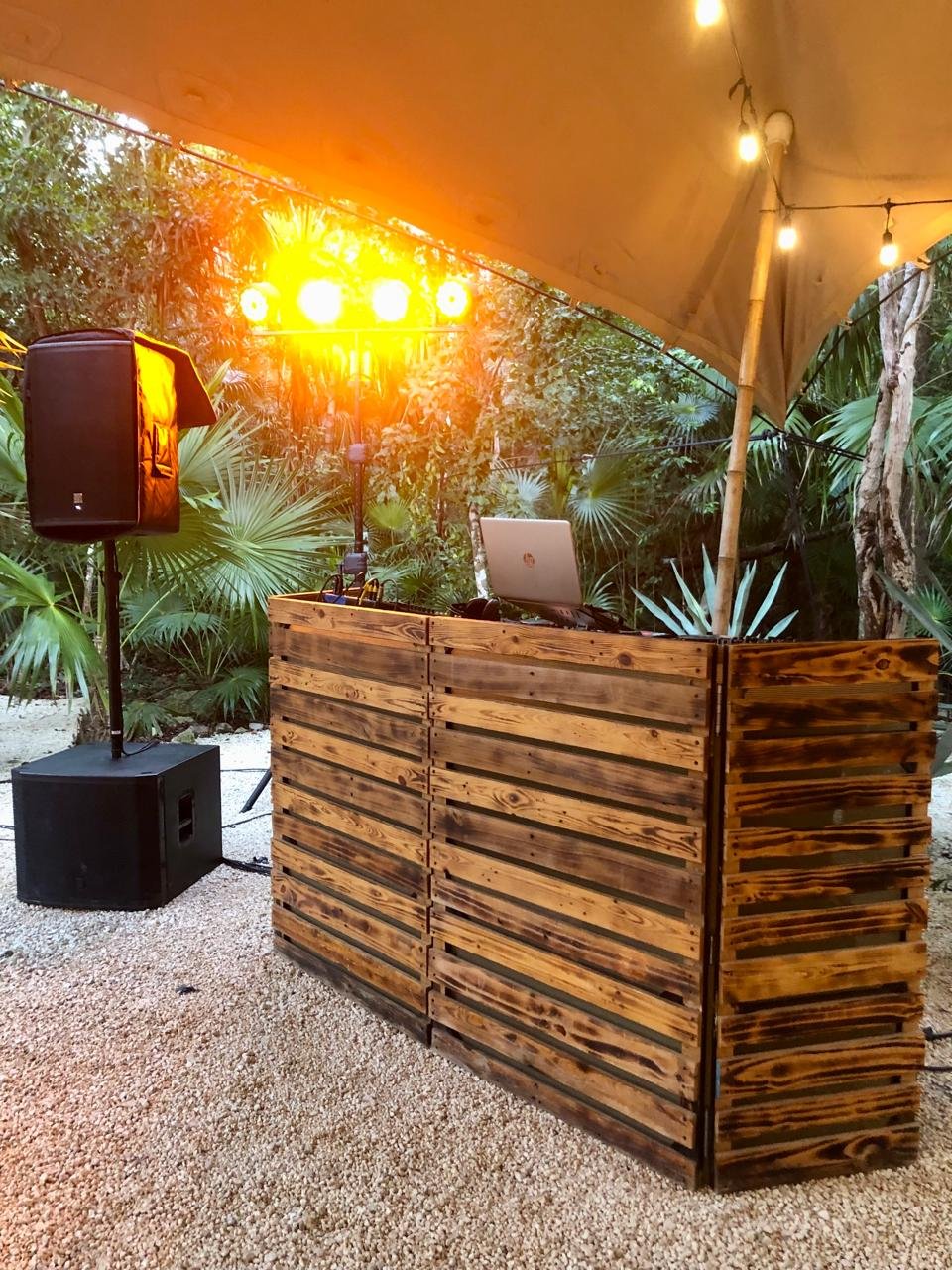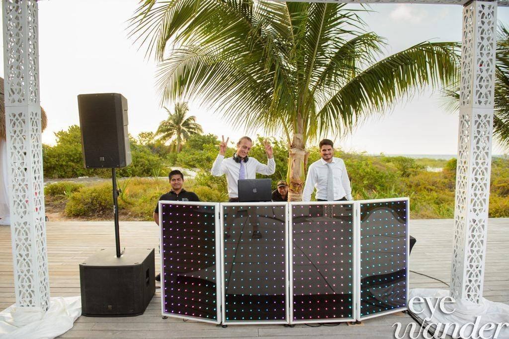 Uno AV can offer 3 options for DJ booths: The first one is the LED booth, which can be used with slow color change, a single color, or can also be used "louder" with strong colors and effects. Our LED DJ Booth can also project bride & groom names (white letters on black background). The white rustic DJ booth is simple and elegant furniture, we can have (and design) the couple's logo printed on the frontal panel (illuminated). The third choice is the deck DJ booth; it's simple and rustic (no names printed but we can add lights to it), perfect for beach receptions such as in Tulum.