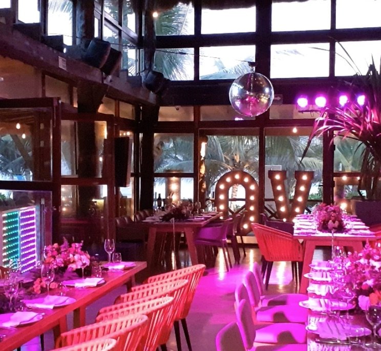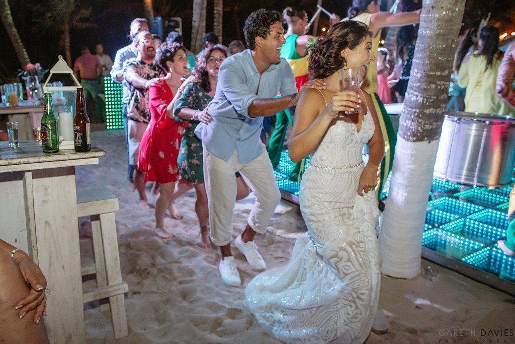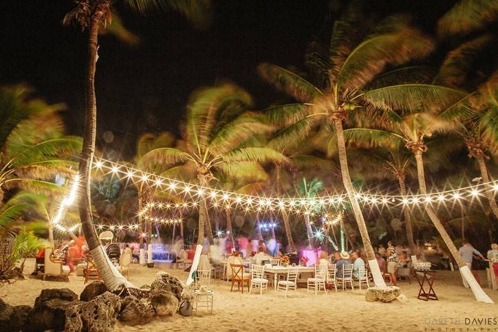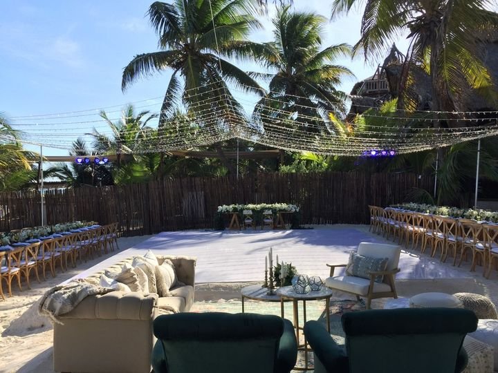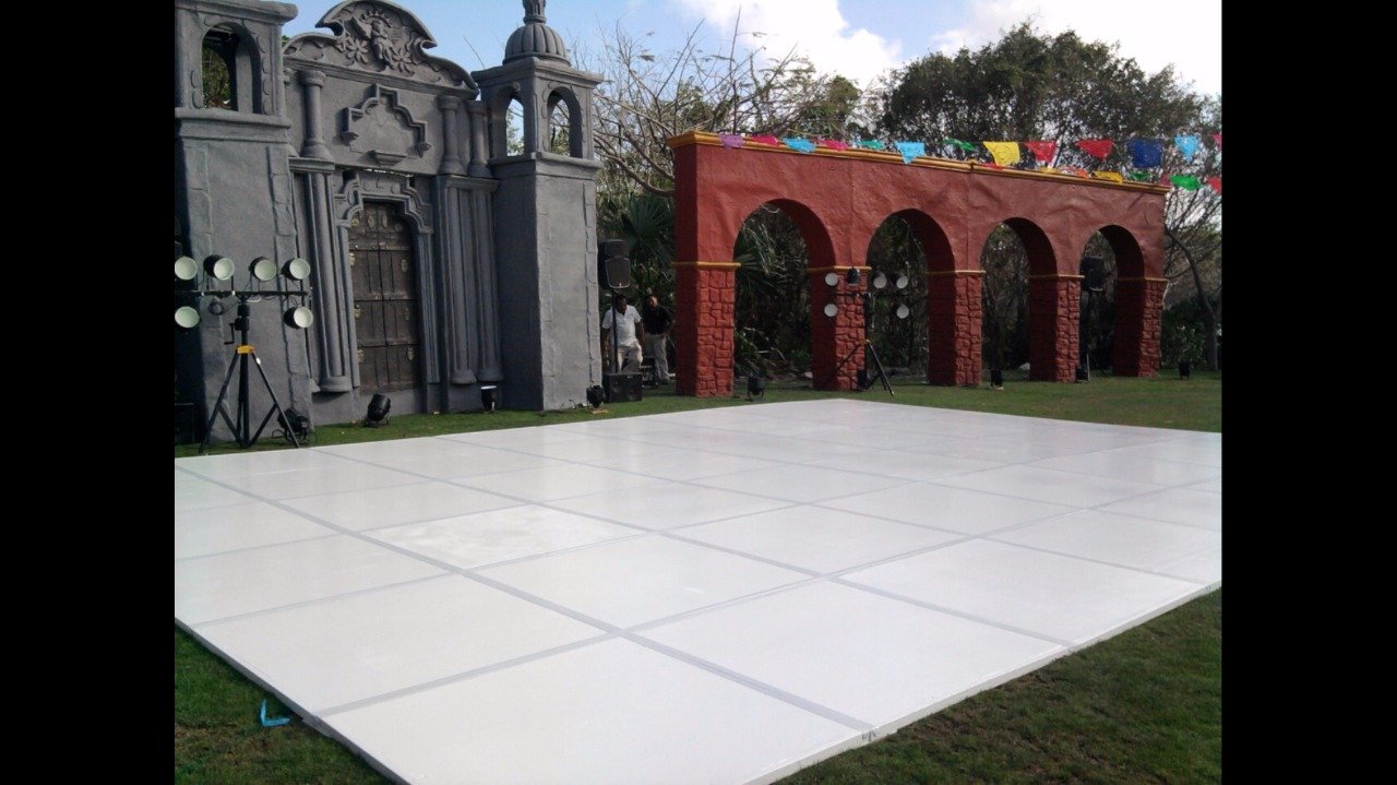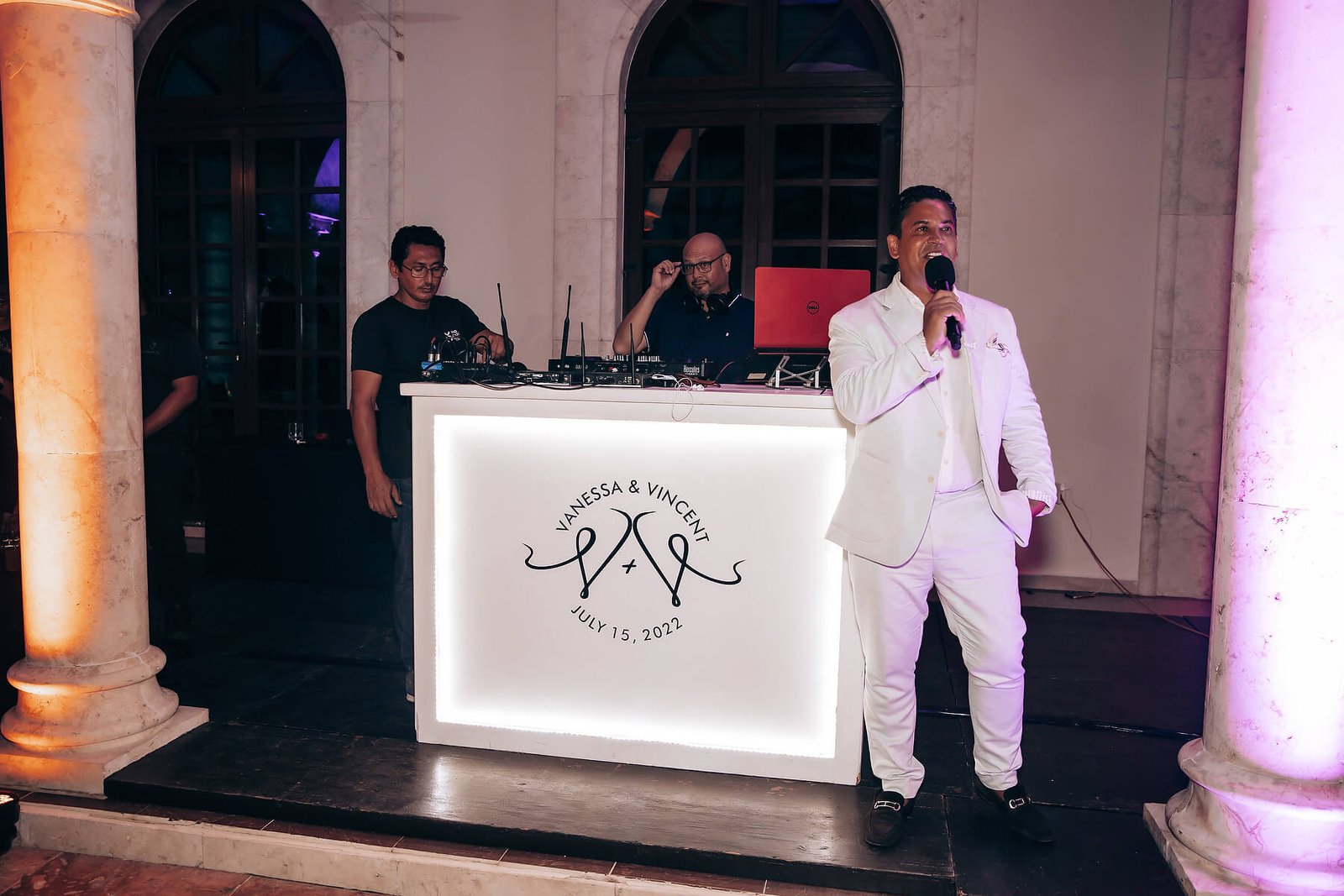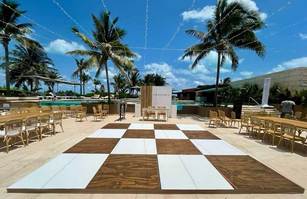 Uno AV can offer 3 options for DJ booths: The first one is the LED booth, which can be used with slow color change, a single color, or can also be used "louder" with strong colors and effects. Our LED DJ Booth can also project bride & groom names (white letters on black background). The white rustic DJ booth is simple and elegant furniture, we can have (and design) the couple's logo printed on the frontal panel (illuminated). The third choice is the deck DJ booth; it's simple and rustic (no names printed but we can add lights to it), perfect for beach receptions such as in Tulum.
